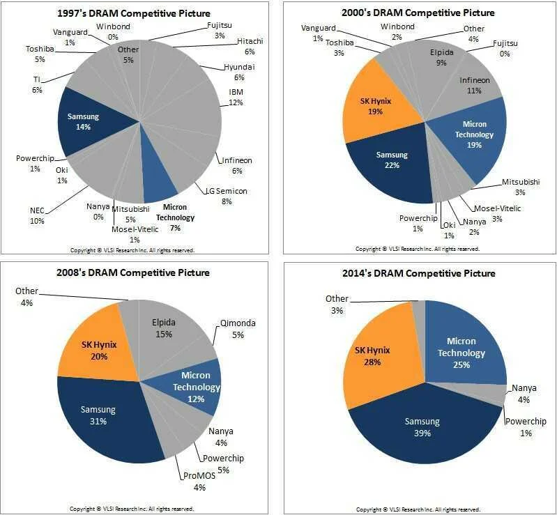 The market has traditionally been cyclical with alternating periods of oversupply (low prices) and under supply (high prices). Economic downturns in the past have exacerbated the situation and led to companies moving out of production, filing for bankruptcy (example: Qimoda in Japan) or getting merged or acquired by the major players. This explains the market consolidation over the past 15 years.